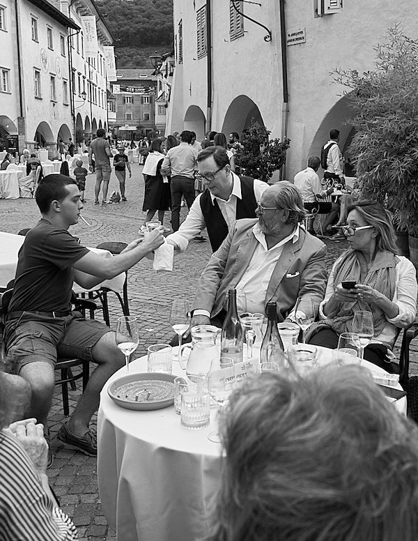 During our annual “Wein & Lauben” event, the streets of Egna transform into a festive setting as visitors gather for a convivial dinner under the starry sky.