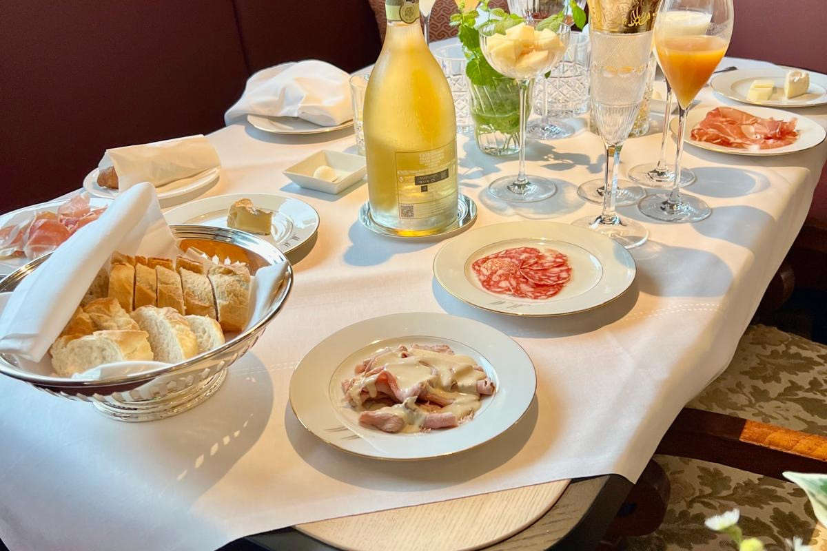 Standard-Frühstück: Cafe oder Tee, Wasser, Brioche oder Brot, Marmelade und Butter. Extras können jederzeit an der Bar gegen Aufpreis bestellt werden.
